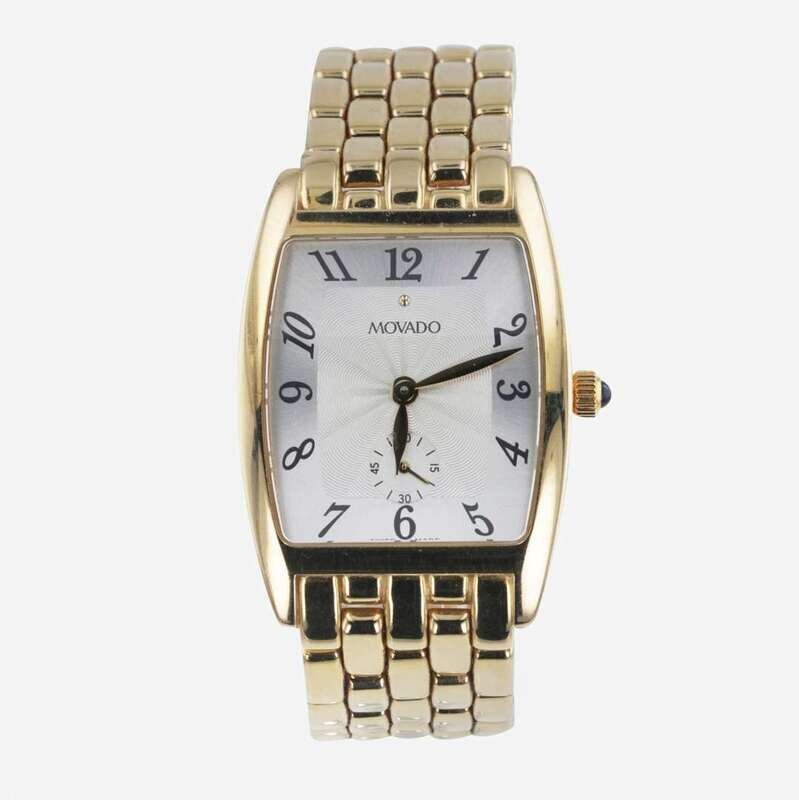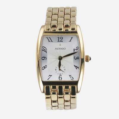 A quartz battery-operated gold Movado watch, silver dial, Arabic Numbers, seconds subdial, flexible panther-style link gold bracelet, sapphire crystal, and butterfly clasp.