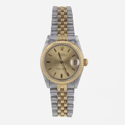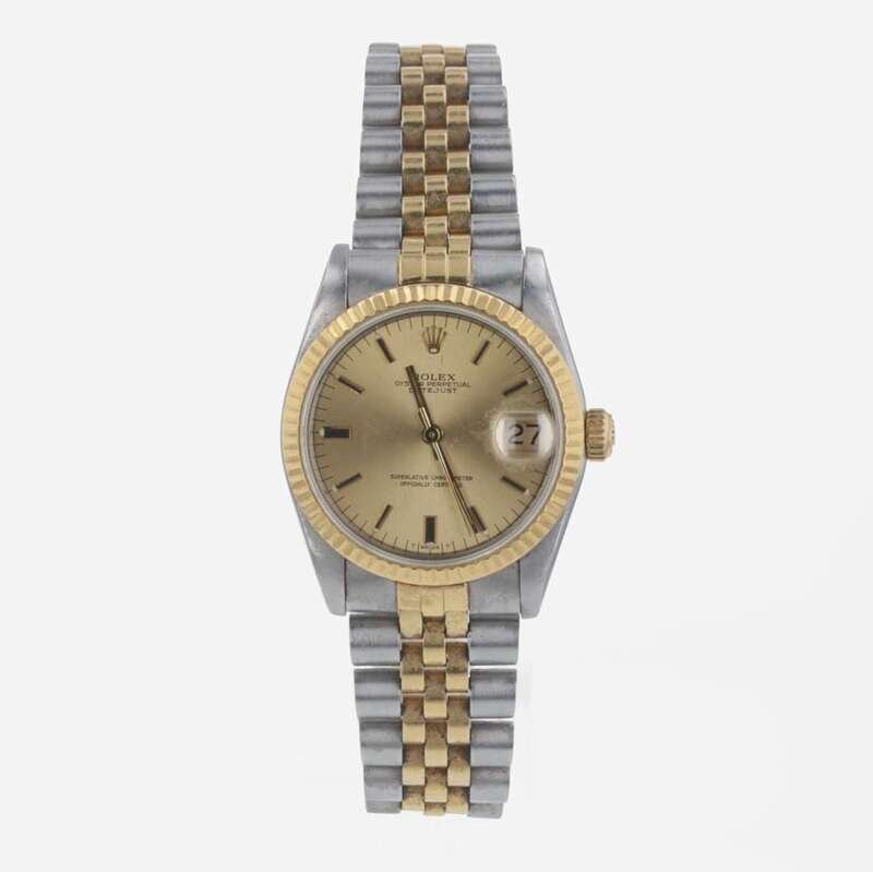 A two-tone stainless steel and yellow gold Oyster Perpetual Rolex wristwatch, with champagne dial, gold hands, and gold stick markers. Date complication at 3 o'clock, crown screws in.
