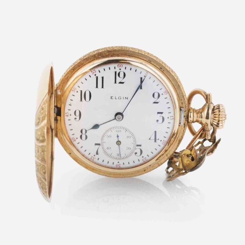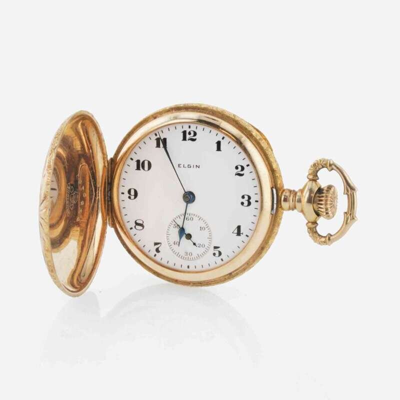 Two 14K yellow gold ladies Hunter case pocket watches by Elgin, both manual wind, with white dials, and stainless steel blue hands. Both watches have black stick markers as well as black Arabic numerals at hour intervals. Both watches have a seconds complication at 6 o'clock. One of the watches comes with a small pin stamped "SIMMONS", and has red Arabic numeral indicators at every five minutes.