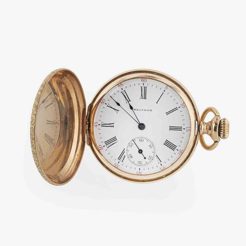 A 14K yellow gold Hunter case manual wind pocket watch by Waltham, with a white dial, black hands, black Roman numeral and stick markers, and red Arabic numeral minute markers. The watch has a seconds complication at 6 o'clock, and reads "WALTHAM" on the dial.
