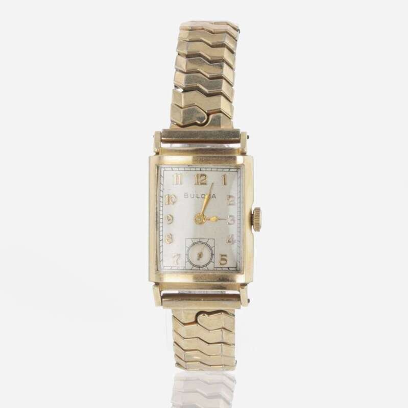 A men's manual wind mechanical movement watch by Bulova, rectangular case, with Arabic number hour markers and seconds subdial.