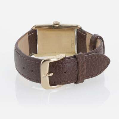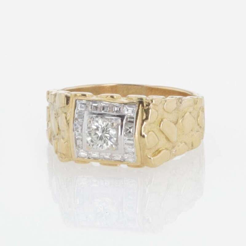 A men's yellow gold ring centering a round brilliant-cut diamond surrounded by baguette-cut diamonds in a square design, paired with a men's Gruen Veri-Thin Precision watch. The watch is a manual wind, rectangle silver dial with Arabic number and dot hour markers, seconds subdial, and leather strap.