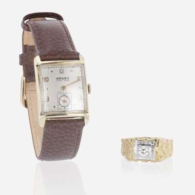 A Men's Gold and Diamond Ring and Gruen Veri-Thin Precision Watch