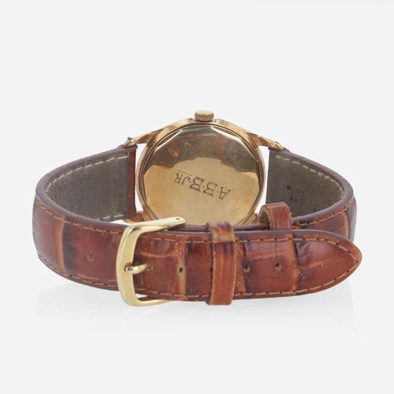 A J.E. Caldwell mechanical manual wind movement watch in a 14K yellow gold round case, with Arabic Numbers, stick markers, gold hands, and a brown embossed leather strap.