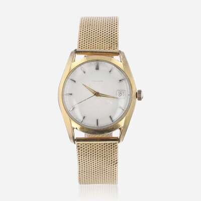Mechanical automatic incabloc movement, white dial with day window at 3 o'clock, gold hands and gold stick hour markers, gold-filled case, gold bracelet with monogrammed buckle.