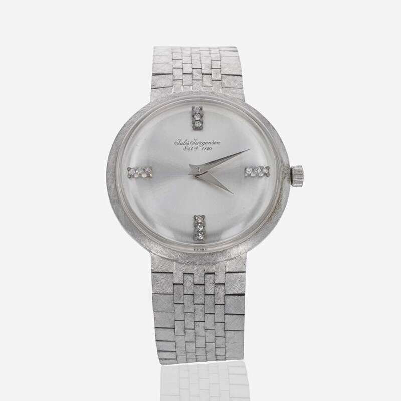 A Jules Jurgensen watch with mechanical manual wind movement cased in a 14K white gold case. Watch has integrated bracelet, acrylic crystal, Florentine textured finishes, and round silver dial with diamond markers.