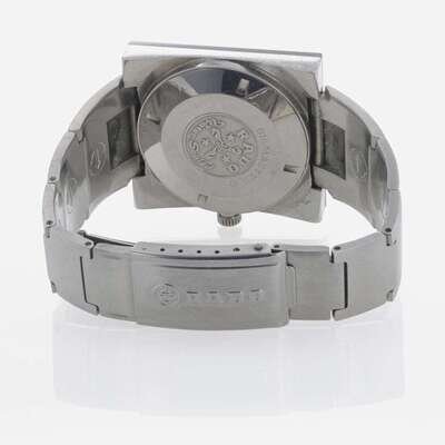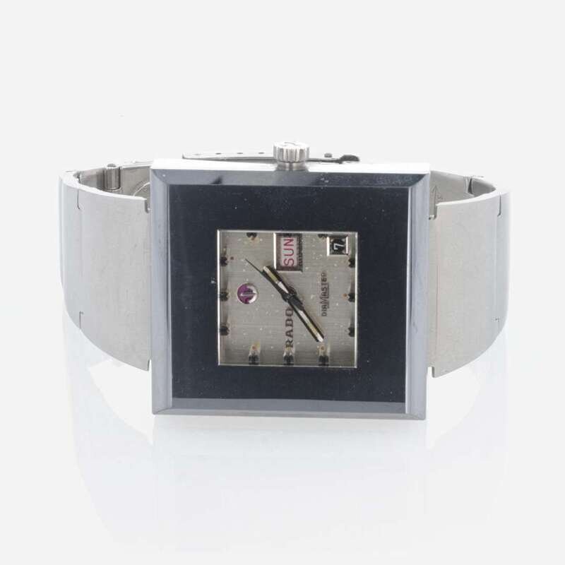 An automatic Rado DiaMaster 10, with scratch-proof tungsten carbide bezel, square silver dial, with day-date functions. A highly rare model, with only two thousand in ever put into production.