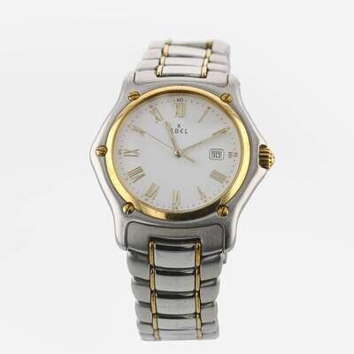 A quartz battery-operated Ebel watch, set in an 18K and stainless steel case and bracelet, with white dial, gold Roman numeral hour markers, and date complication at 3 o'clock.