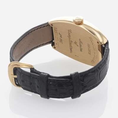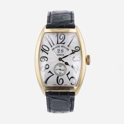 No. 115 Frank Muller men's wristwatch, model number 6850 S6 GG, with additional embossed brown leather strap, original case, and certificate of origin. Automatic movement, with seconds complication at 6 o'clock, and date at 12 o'clock. Black hands and Arabic numerals, on a white dial, set in an 18K tonneau-shaped yellow gold case.