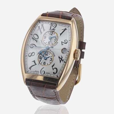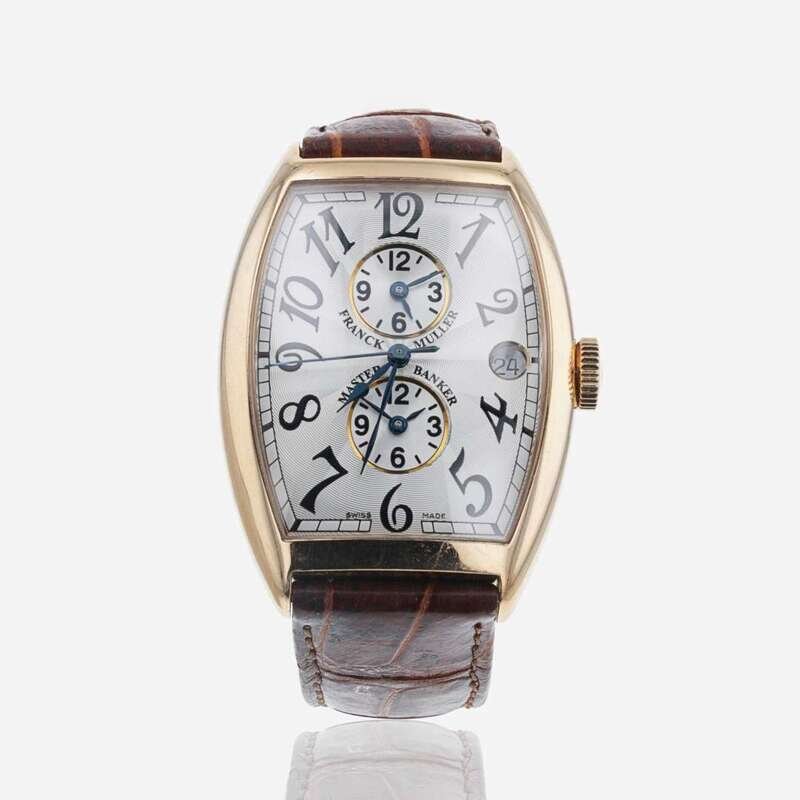 An automatic mechanical movement Franck Muller Master Banker watch, with 18k rose gold case, and Arabic oversized number hour markers. Featuring three different time zones and date complications, with blue steel hands with a second sweep hand.