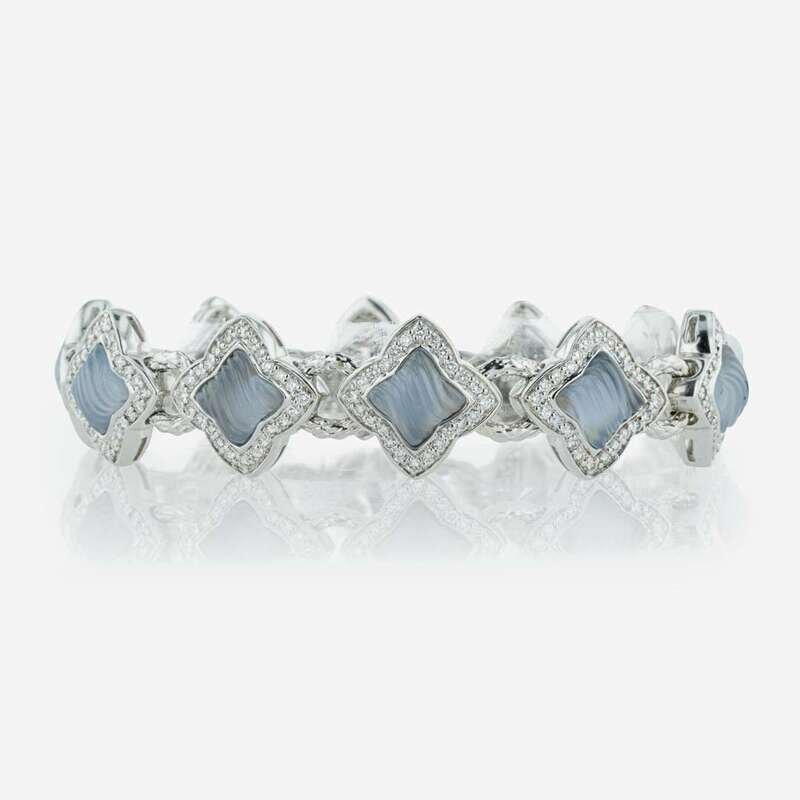 An 18K white gold David Yurman bracelet, featuring wavy ridge-textured quatrefoil-cut chalcedony, surrounded by numerous round-cut diamonds, held together with textured white gold links. Diamonds are near colorless (G - H), with VS1 - VS2 clarity. Total estimated weight of diamonds: 2.00 carats.
