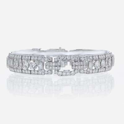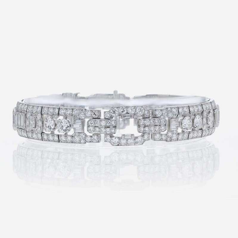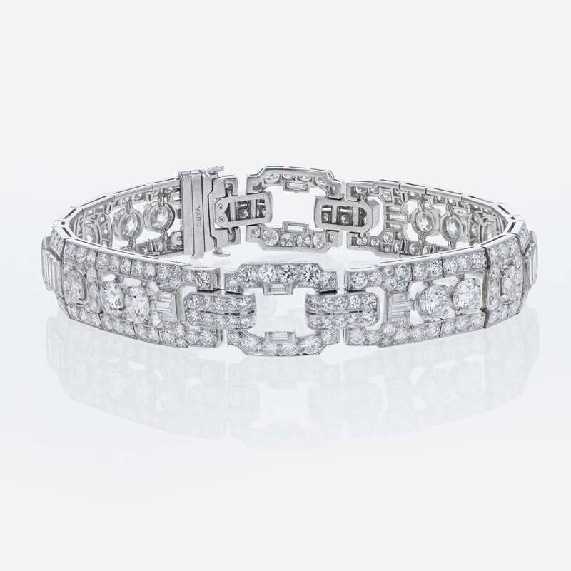 An Art Deco diamond and platinum bracelet by Raymond Yard, set with two hundred fifty-six diamonds in varying shapes and sizes. Diamonds are near colorless (G - J), with SI clarity. Total estimated weight of diamonds: 12.00 carats.