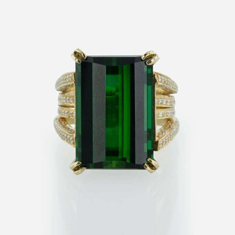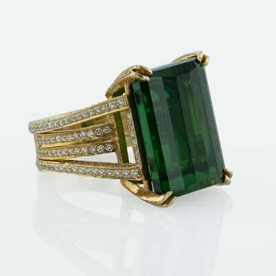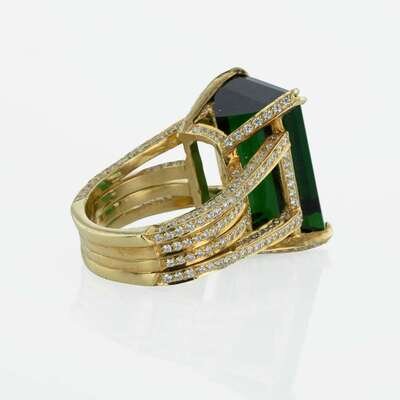 An 18K yellow gold ring designed as four bands, reaching out to become claw settings for an 18.5 x 12.5mm (approximately 20.00 carat) green emerald-cut tourmaline, set with round brilliant-cut diamonds covering the band. Diamonds are near colorless (G - H), with VS1 - VS2 clarity. Total estimated weight of diamonds: 1.50 carats.