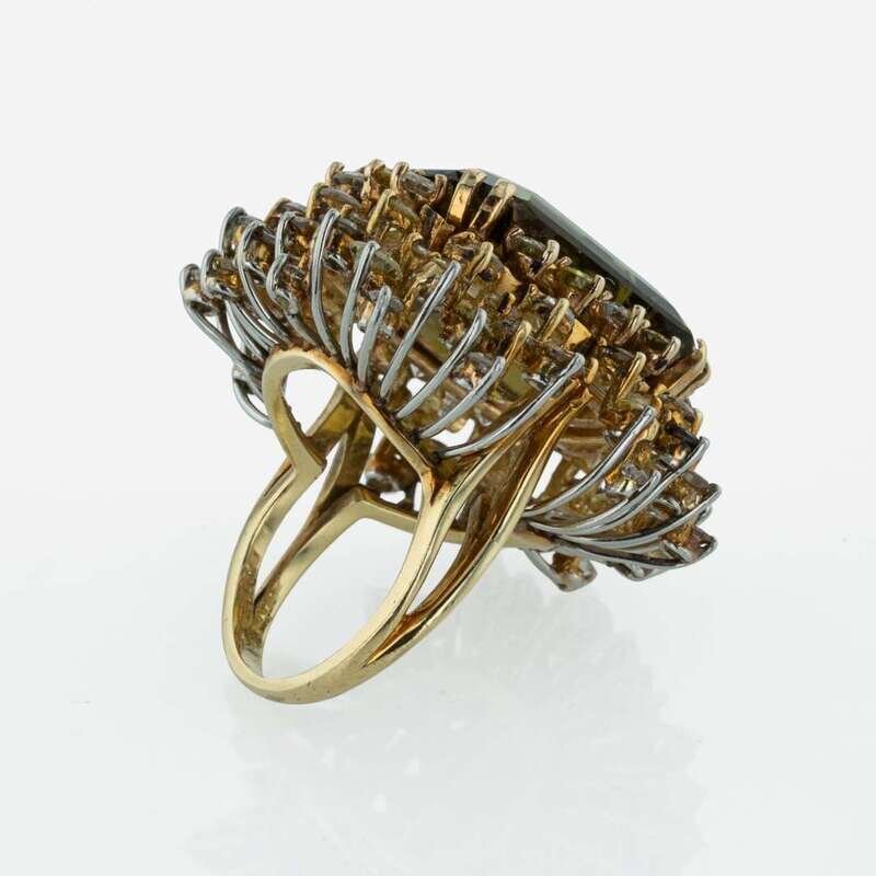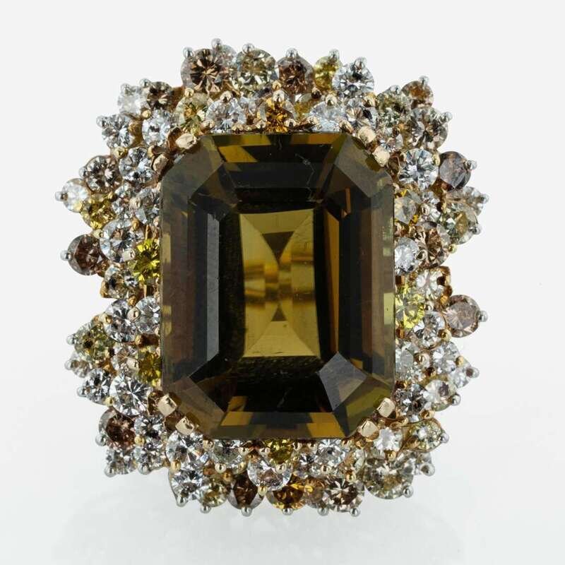 An 18K yellow gold ring centering a large rectangular-cut natural tourmaline measuring approximately 25.00 carats, surrounded by multicolored round-cut diamonds. Diamond colors include orange, champagne, peach, vivid yellow, white, and fancy yellow, with VS clarity. Total estimated weight of diamonds 3.00 carats.