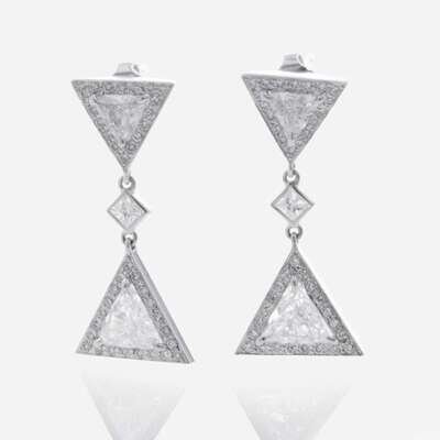 A pair of 18K white gold and diamond earrings, with each earrings featuring two trillion-cut diamonds, surrounded by small round brilliant-cut diamonds, and connected at the point by a carre-cut diamond. Diamonds are near colorless (G - J), with SI clarity. Total estimated weight of diamonds: 1.40 carats.