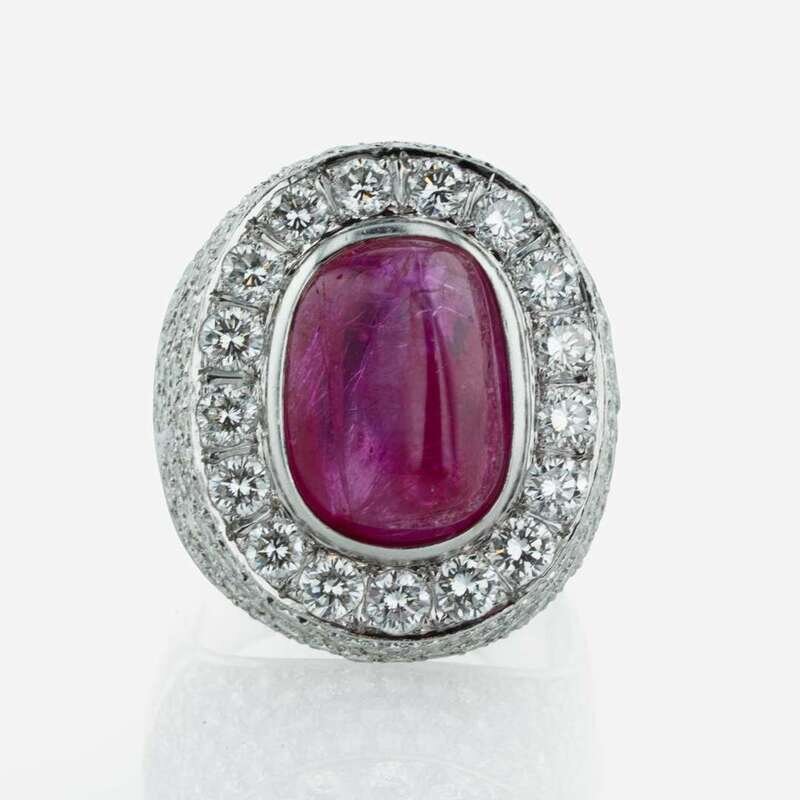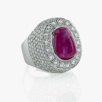 A prominent 9.39 carat sugarloaf ruby surrounded by round brilliant-cut diamonds on a wide 18K white gold ring. Diamonds are near colorless (G - J), with VS - SI clarity. Total estimated weight of diamonds: 5.22 carats. GIA certification number: 2211498520.