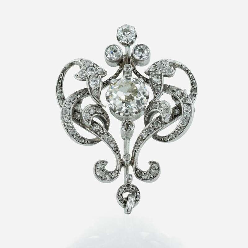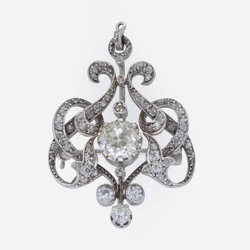 A platinum Art Deco pendant, also designed as a pin, centering a 2.25 carat mine-cut diamond, SI1, H/I color. Surrounded by smaller mine-cut diamonds set throughout.