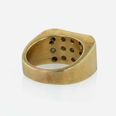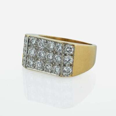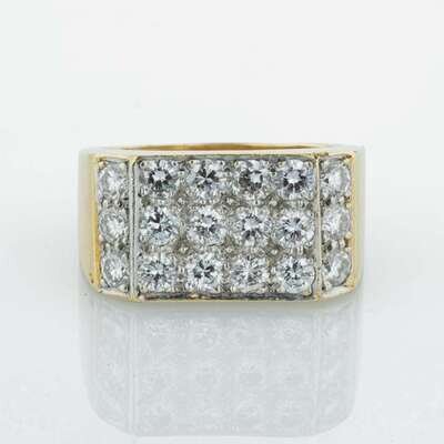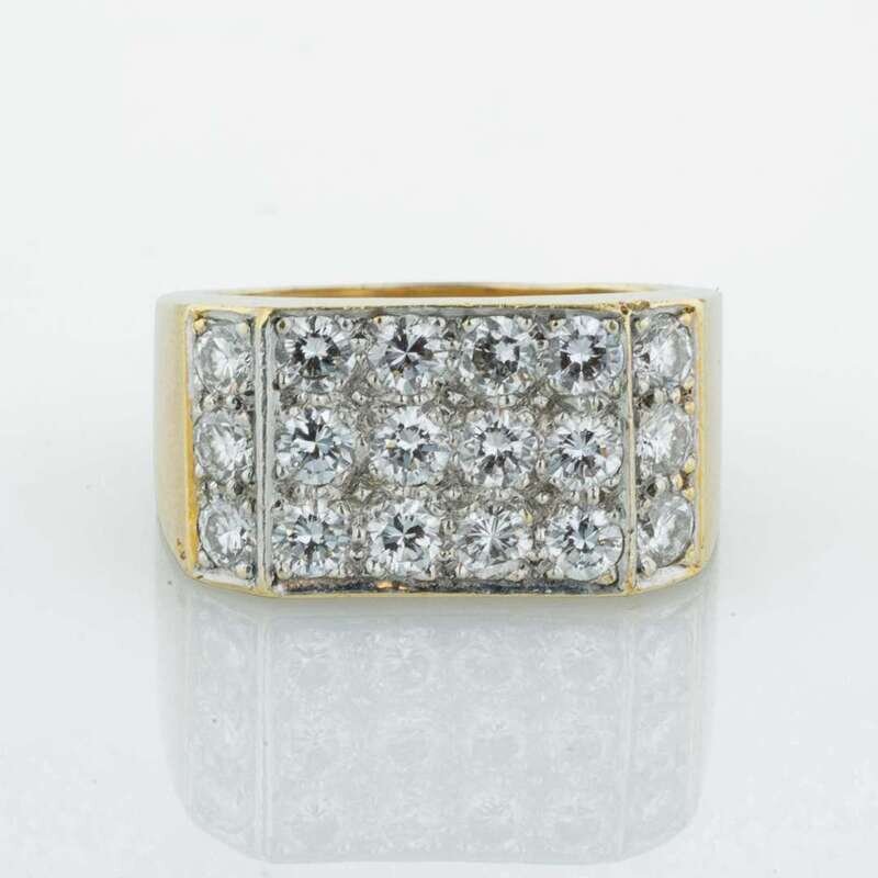 An 18K yellow gold men's ring by Tiffany & Co. with a flat top covered in round brilliant-cut diamonds. Diamonds are near colorless (G - J), with SI clarity. Total estimated weight of diamonds: 2.70 carats.