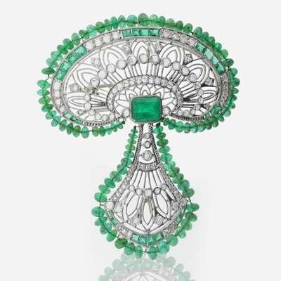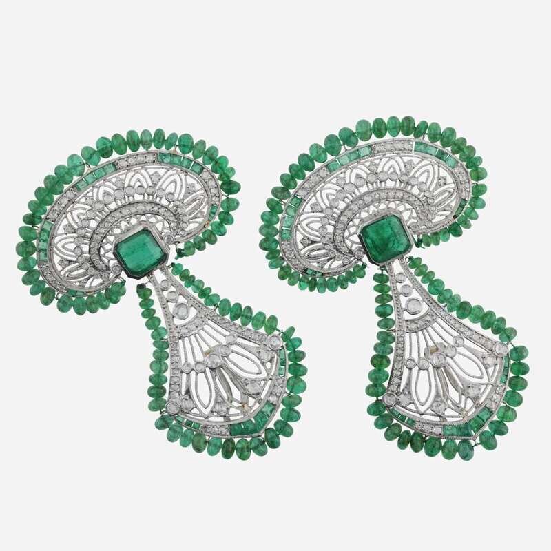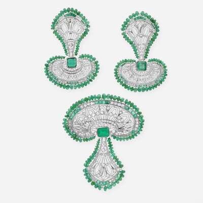 An impressive set of platinum earrings and pendant, designed in a round geometric filigree pattern, with lines of round green beryl beads around the outside, and centering a rectangular-cut emerald. The design is accented by rose-cut diamonds emeralds of various shapes and sizes. Total estimated weight of diamonds: 6.05 carats. Total estimated weight of emeralds: 15.31carats.