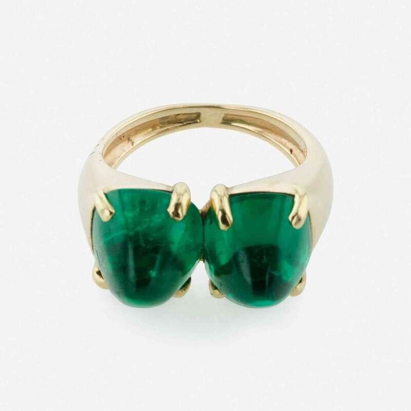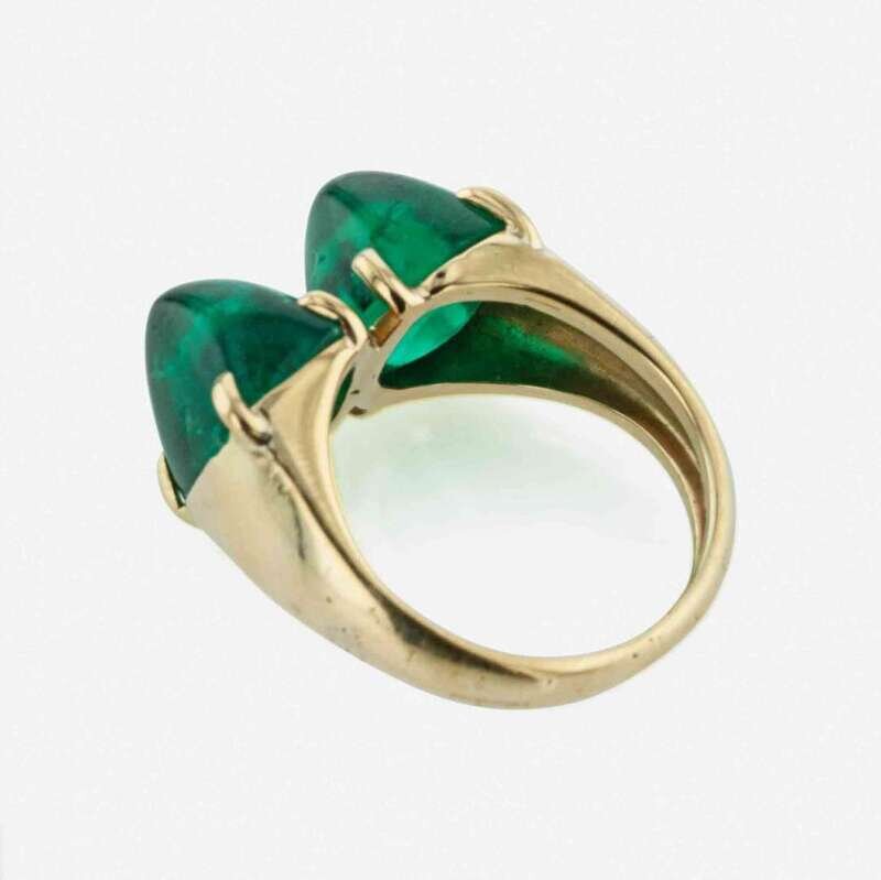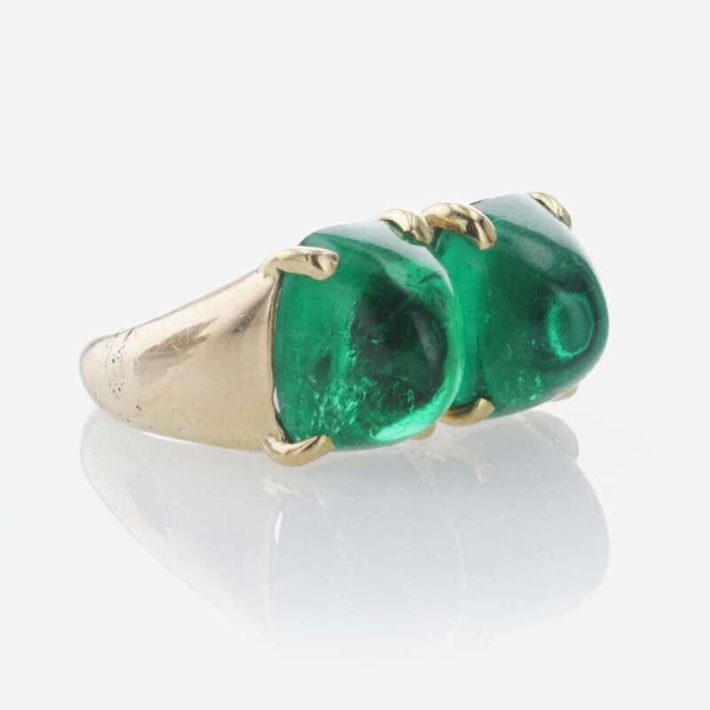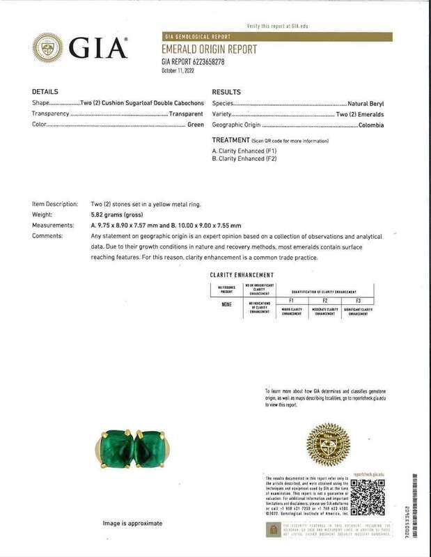 A 16K yellow gold ring, featuring two adjacent lustrous cushion sugarloaf emeralds, in yellow gold claw settings. GIA certification number: 6223658278.