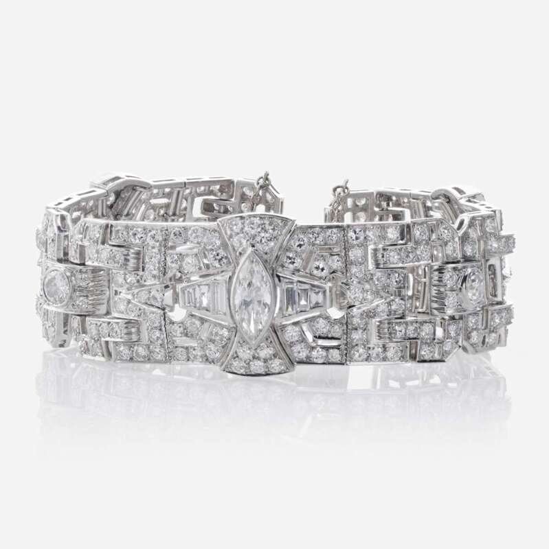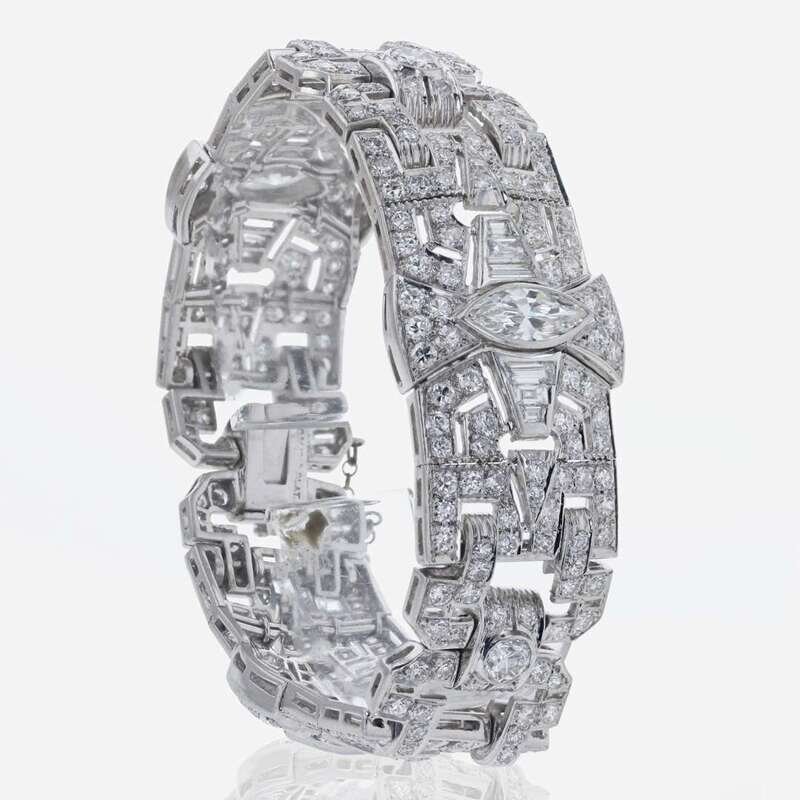 A platinum and diamond bracelet, designed in Art Deco style, set with near colorless (G - J) and SI clarity diamonds in a variety of cuts and sizes. Total estimated weight of diamonds: 13.00 carats.