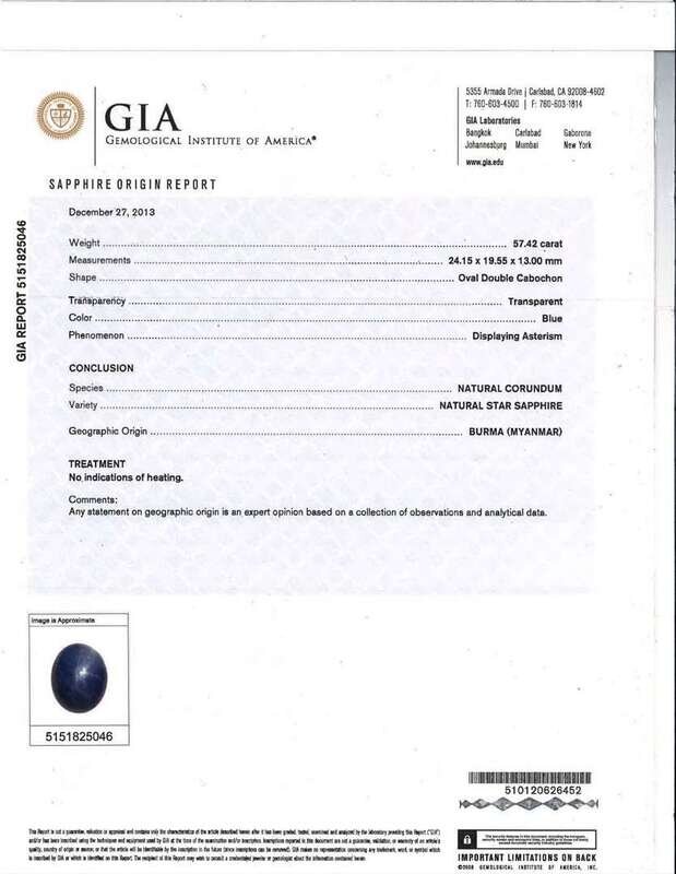 A large platinum brooch, featuring a 57.42 carat oval double cabochon-cut sapphire, surrounded by sweeping loops of platinum set with numerous diamonds of various cuts and sizes. Diamonds are near colorless to faint color (G - J, K - M), with SI - I clarity. Total estimated weight of diamonds: 25.00 carats. Sapphire comes with GIA certification number: 5151825046.