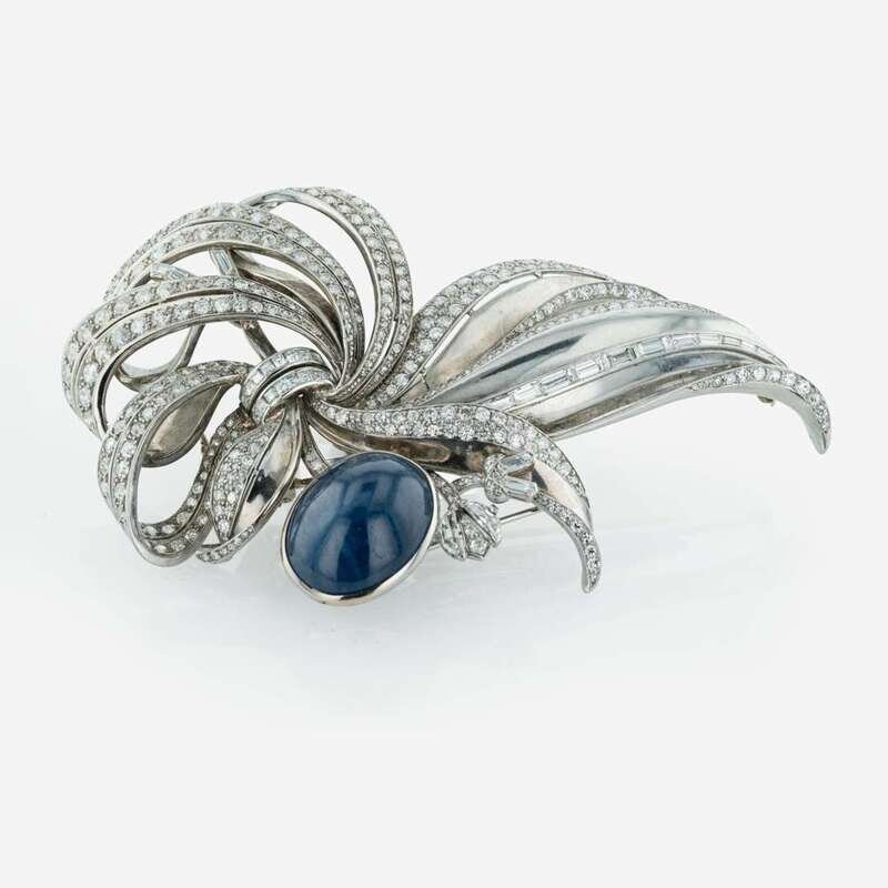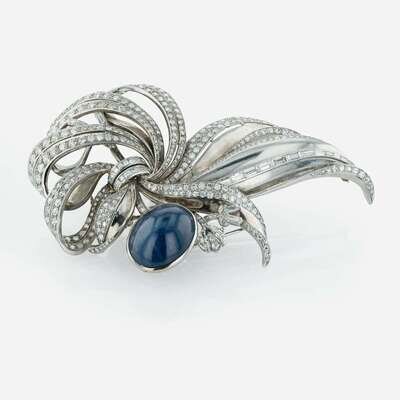 A Large Sapphire, Platinum, and Diamond Brooch