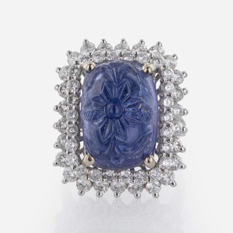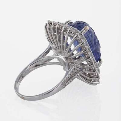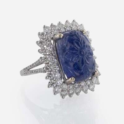 A 14K White Gold, Carved Sapphire, and Diamond Ring Natural Corundum Sapphire