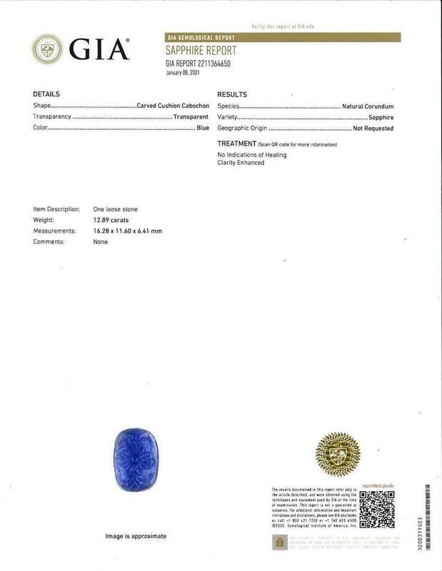 A natural corundum carved cushion cabochon-cut 12.89 carat sapphire carved with a flower motif, surrounded by small round-cut diamonds on a 14K white gold setting. Diamonds are near colorless (G - J), with I clarity. Total estimated weight of diamonds: 2.66 carats. GIA certification number: 2211364650.