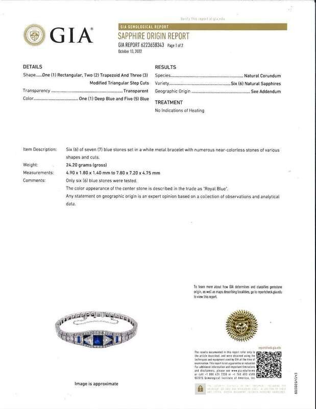 An Art Deco platinum bracelet, centering a large square-cut natural unheated royal blue sapphire, surrounded by diamonds, and one rectangular, two trapezoid and three modified triangular step-cut sapphires. Diamonds are near colorless (G -J), with SI clarity. Total estimated weight of diamonds: 6.40 carats. GIA certification numbers: 6223658343 and 5222679933.