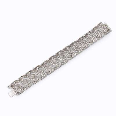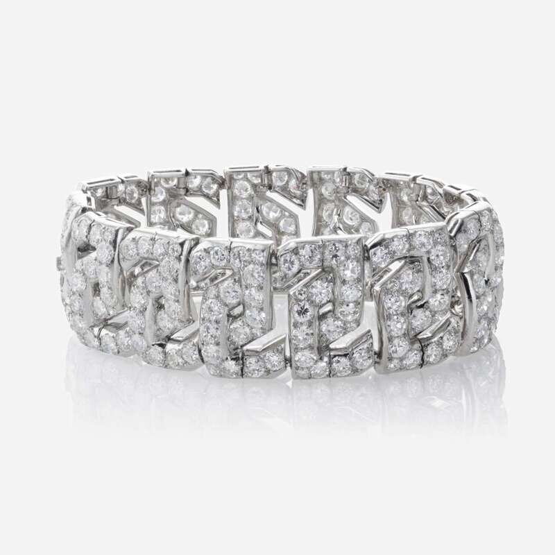 A platinum bracelet with highly flexible interlocking links set throughout with old European-cut diamonds. Diamonds are G - H color, with VS-SI clarity, and a few I clarity. Total estimated weight of diamonds: 25.50 carats.