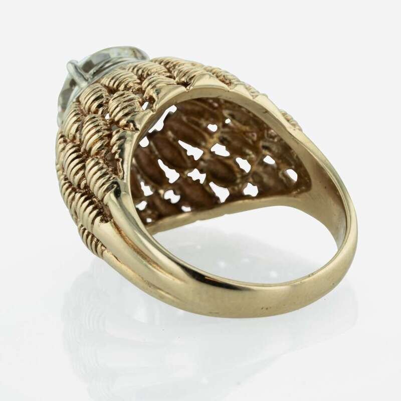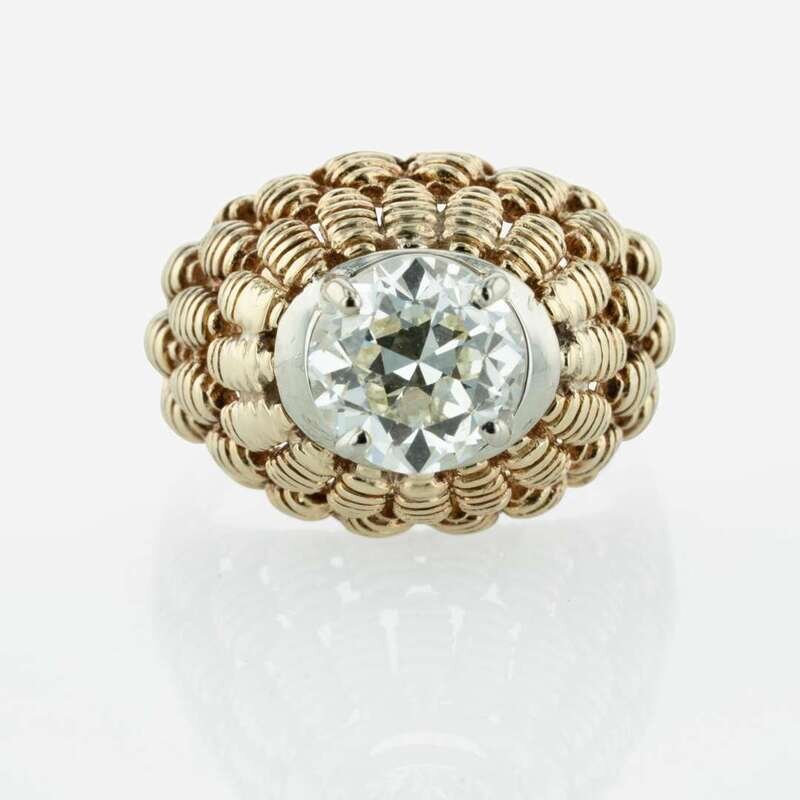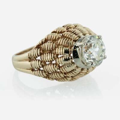 A solitaire diamond in a 14K white gold setting on a prominent textured 14K yellow gold dome and band. Diamond is M color, with VS2 clarity. Total weight of diamond: 2.27 carats. Comes with copy of GIA certification number: 2225546727.