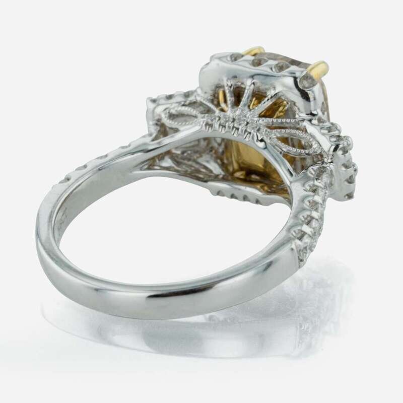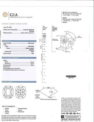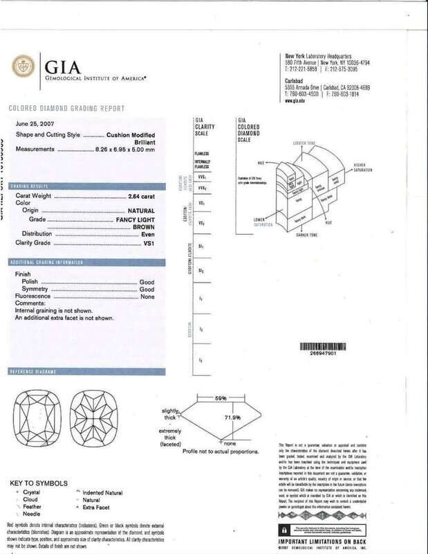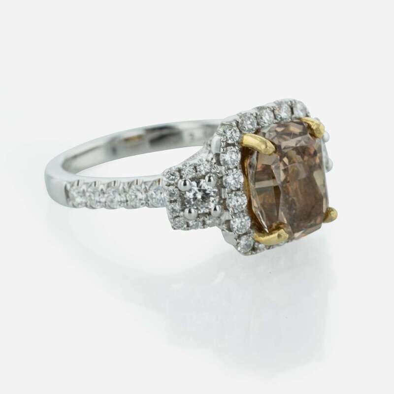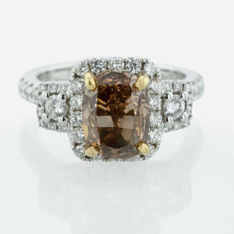 An 18K white gold engagement centering a fancy light brown cushion modified brilliant-cut diamond, measuring 2.64 carats, surrounded by numerous near colorless diamonds in various shapes and sizes. Colored diamond is VS1 clarity, accent diamonds are near colorless (G - J) and SI - I clarity. Total estimated weight of diamonds: 3.84 carats. GIA certification number: 16150935.