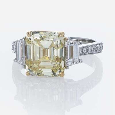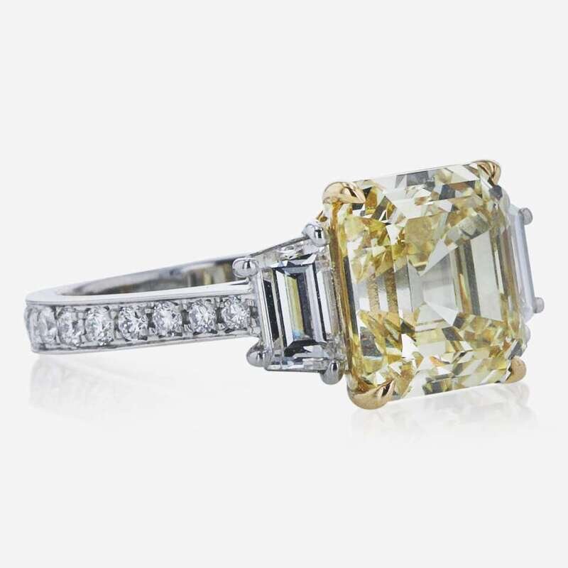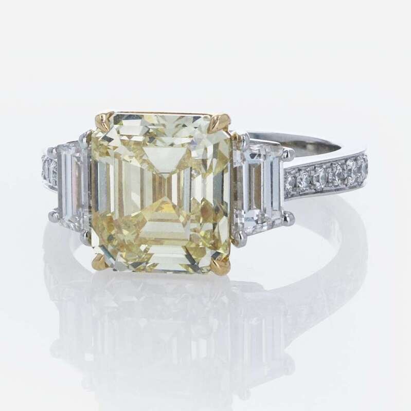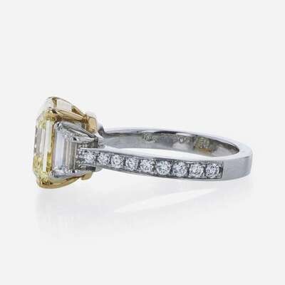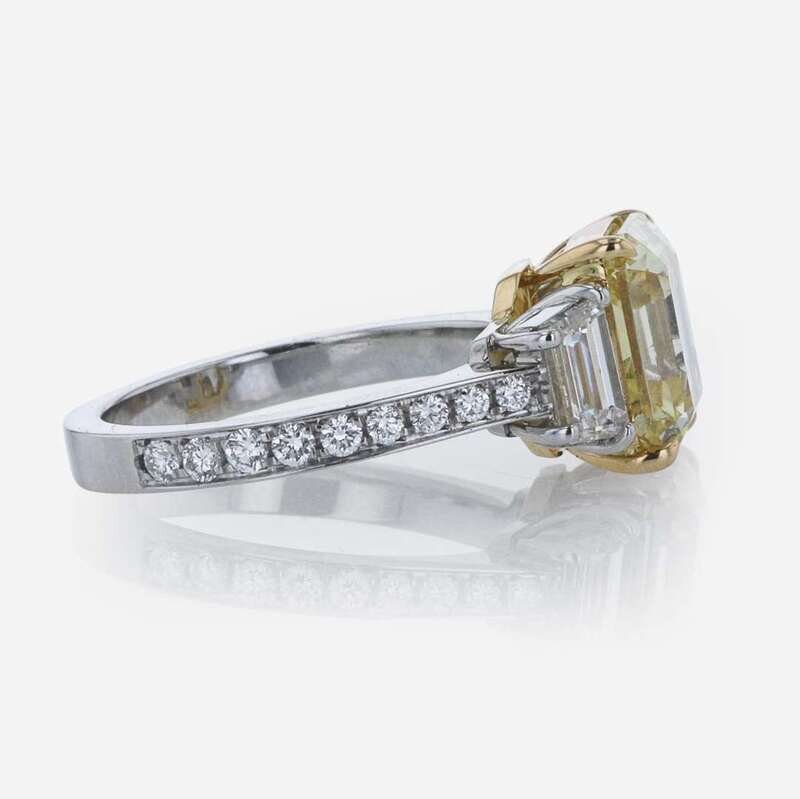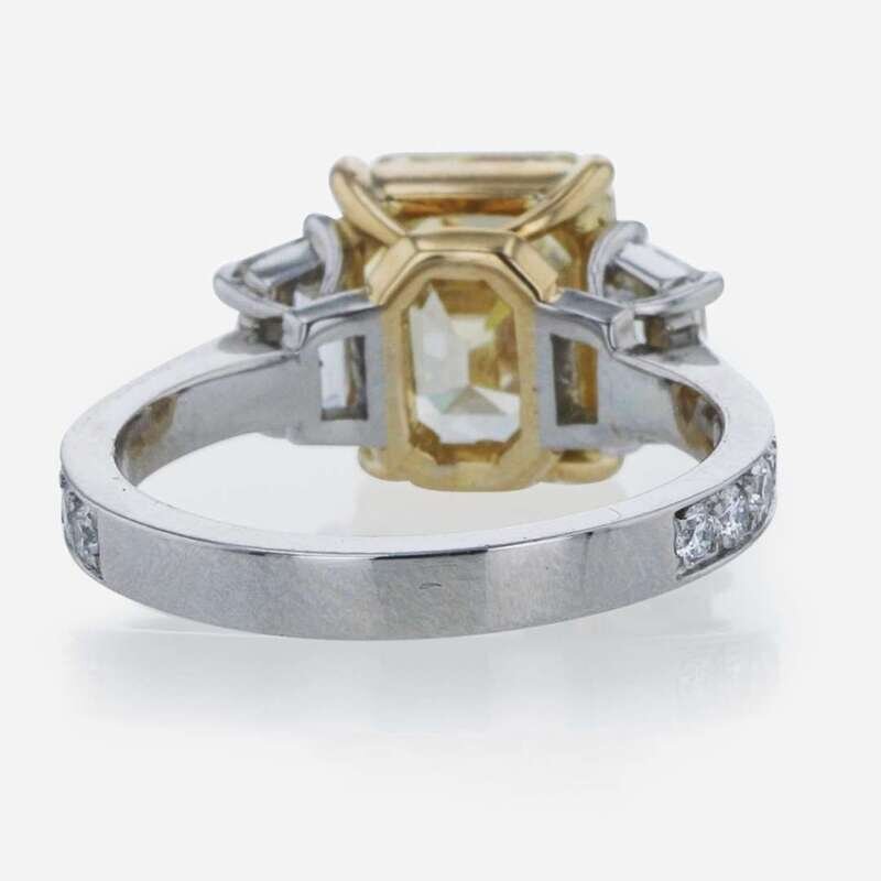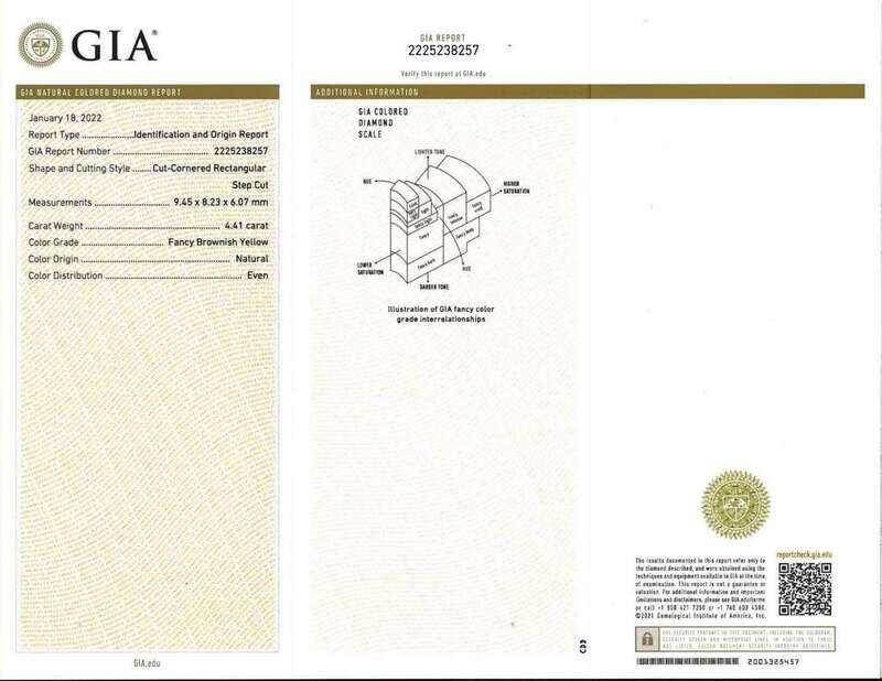 A platinum and yellow gold ring, centering a 4.41 carat fancy brownish yellow rectangular step-cut diamond (VS2 clarity) flanked by two near colorless (G - J, SI clarity) step-cut diamonds, and small round brilliant-cut diamonds (G - J, with SI clarity) leading down the band. Total estimated weight of diamonds: 1.47 carats. GIA certification number: 2225238257.