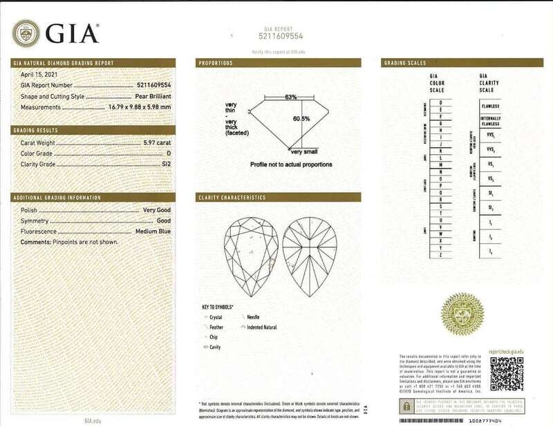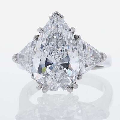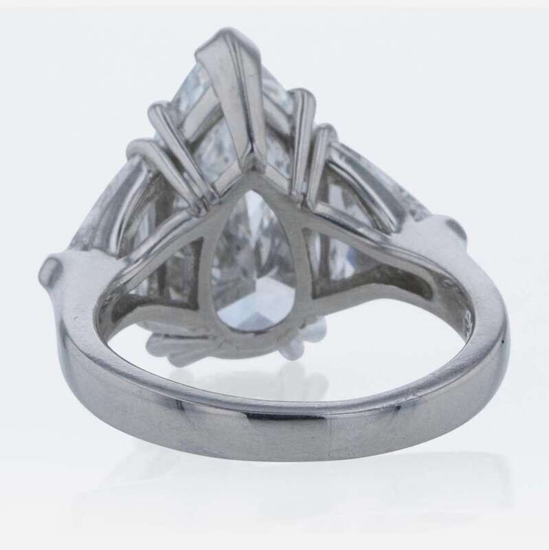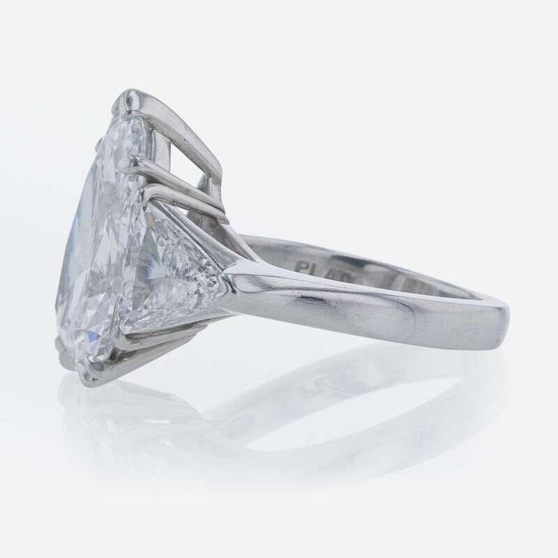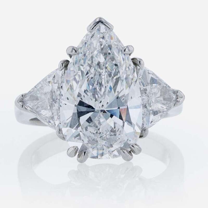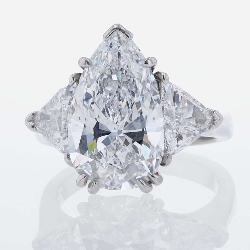 A platinum ring, centering a 5.97 carat pear-shaped diamond and flanked by two trillion-cut diamonds. Pear-cut diamond is D color, trillions are F color, all diamonds having SI2 clarity. Total estimated weight of diamonds: 7.97 carats. GIA certification number: 5211609554.