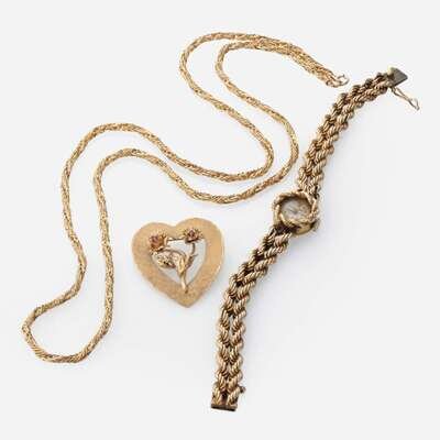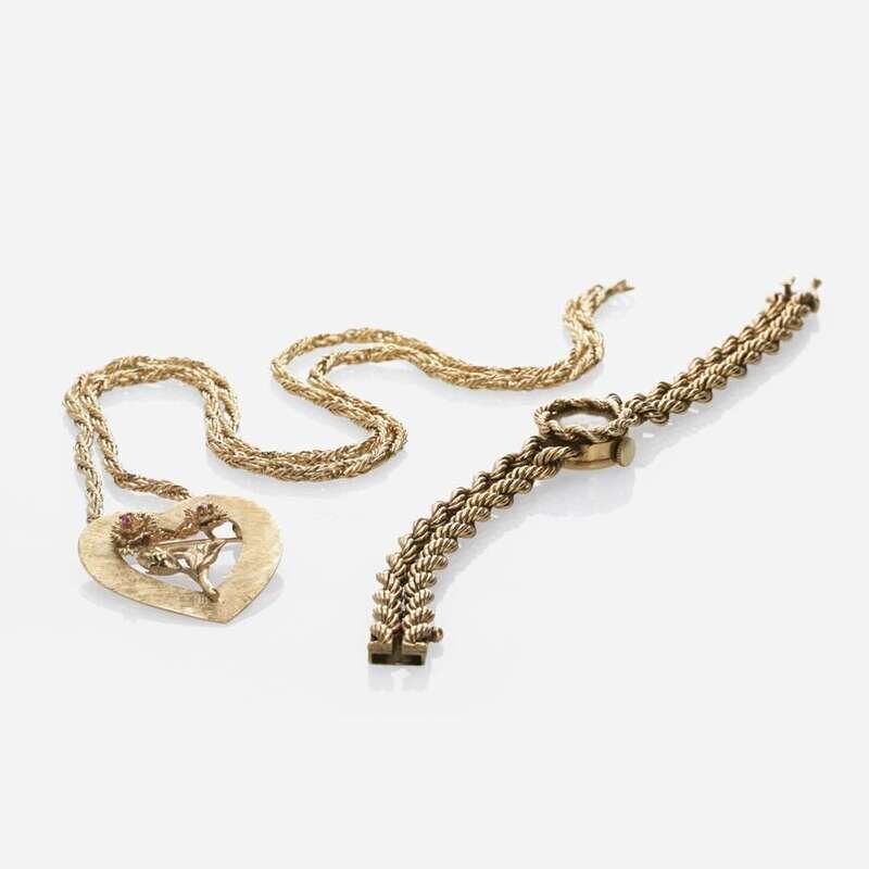 A collection of yellow gold jewelry and watch, including a heart-shaped brooch set with two round rubies, a Spiga chain, and a yellow gold rope chain watch by Mathey-Tissot. Watch is manual wind, with a gold dial and gold hour markers.