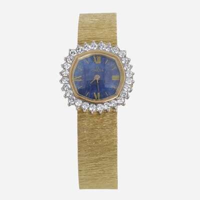 A ladies Omega manual wind mechanical movement watch, with an octagonal carved lapis lazuli dial, gold hands, Roman numerals and stick hour markers. The bezel is set with round brilliant-cut diamonds, and features an 18K gold textured integrated bracelet with special safety lock mechanism. Diamonds are near colorless (G - J), with SI clarity Total estimated weight of diamonds: 1.10 carats.