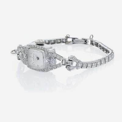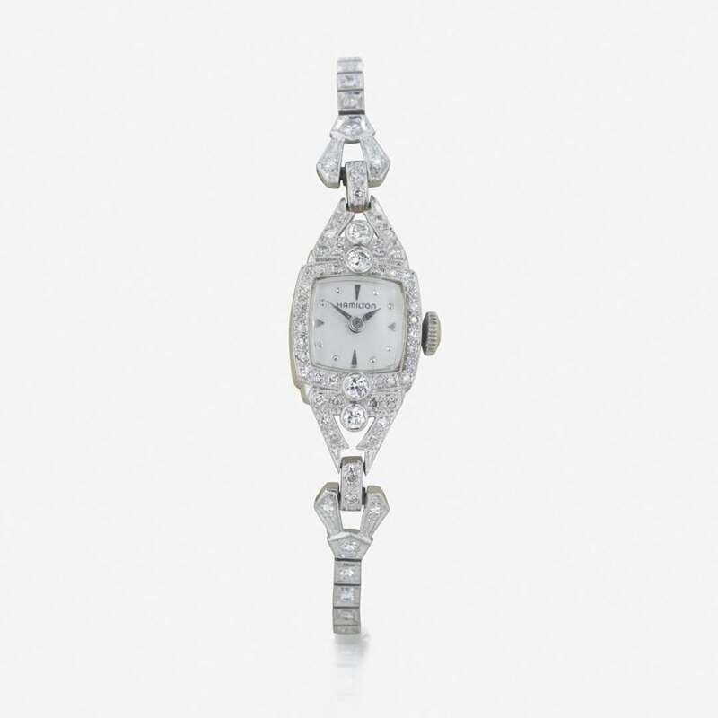 A ladies Hamilton watch, 17 jewel movement with platinum case and bracelet set with single-cut round diamonds. Total estimated weight of diamonds: 0.95 carats.