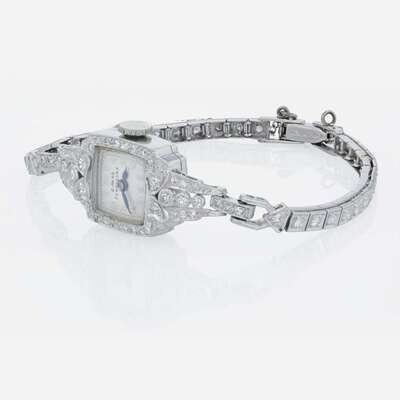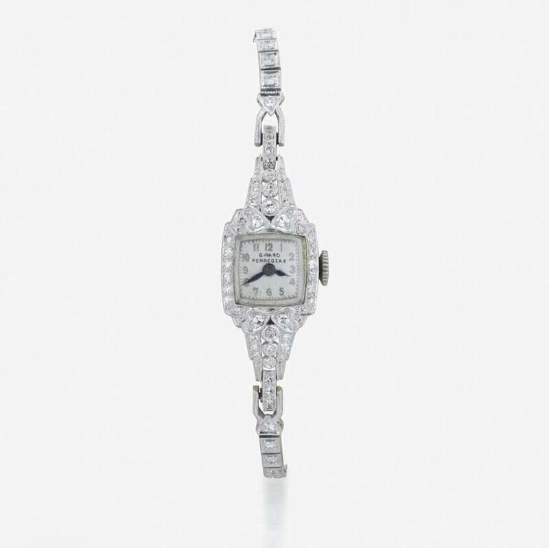 A platinum and diamond watch by Girard-Perregaux, 17 jewel movement with platinum case, and bracelet set with single-cut diamonds. Total estimated weight of diamonds: 0.95 carats.