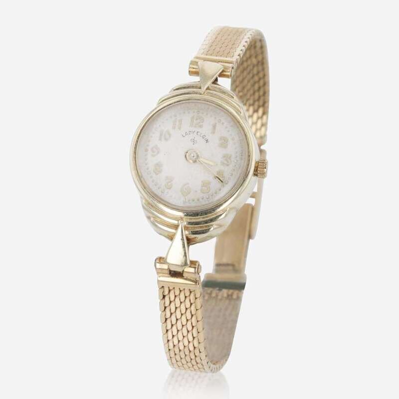 A retrofitted quartz battery-operated movement by Elgin in a 14K gold round case, round dial with Arabic number markers. Bracelet is 18K yellow gold with a fold-over clasp.