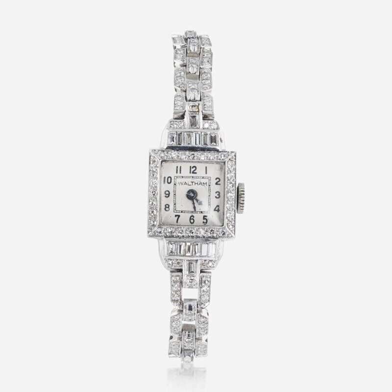 A mechanical manual wind ladies diamond watch, with square white dial with black Arabic number hour markers. Diamond set links and case with an attached safety chain. Total estimated weight of diamonds: 1.90 carats.