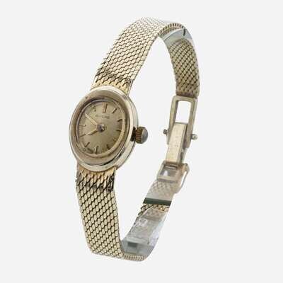 A manual wind ladies bracelet dress watch, with an oval case, gold dial, and gold stick markers, with integrated bracelet and a fold-over clasp.