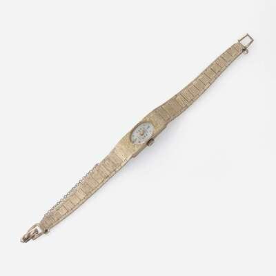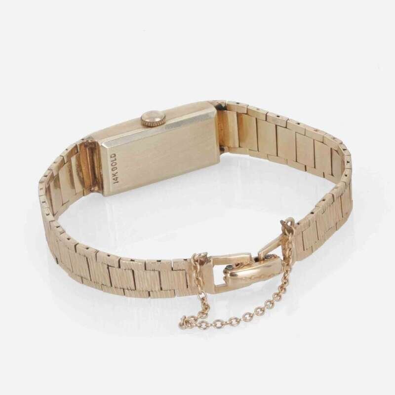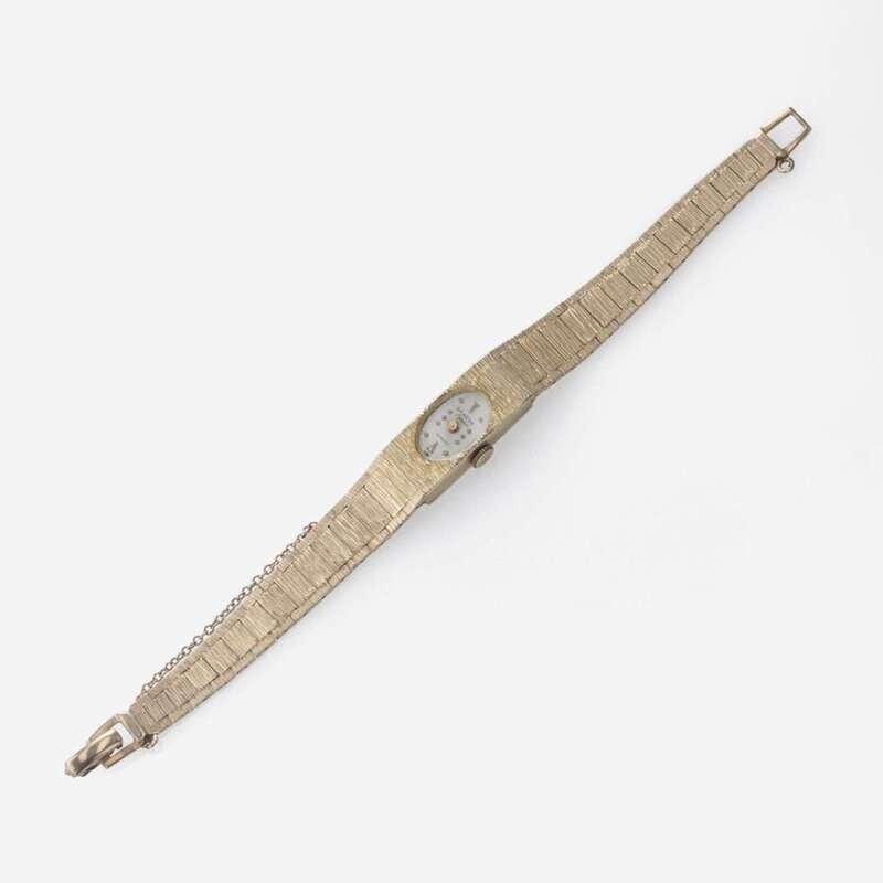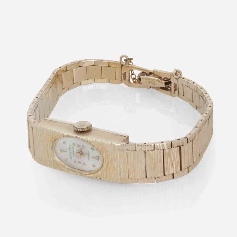 Ladies manual wind gold watch, face of which indicates "Geneva 17 Jewels Incabloc" and 14K yellow gold band. White oval dial, with gold hands and hour markers.