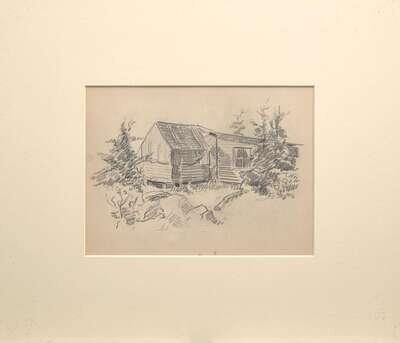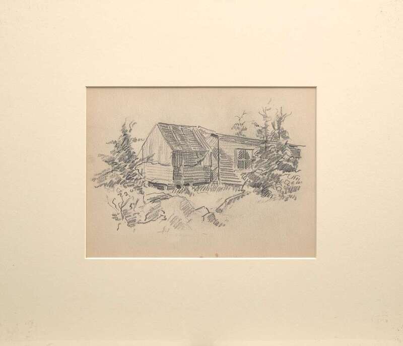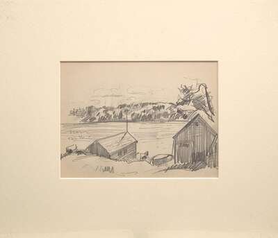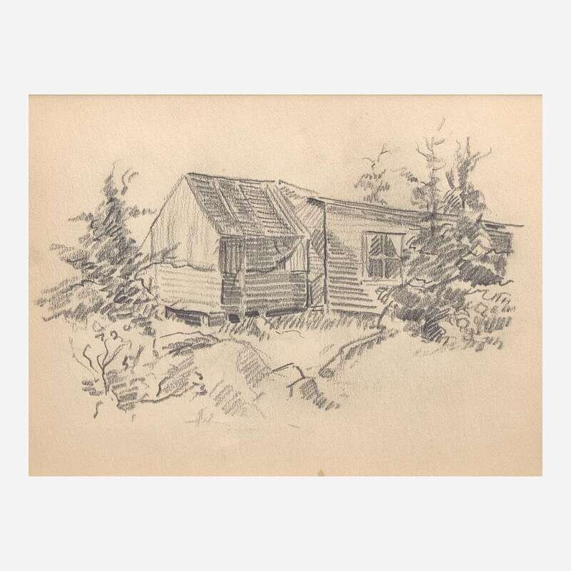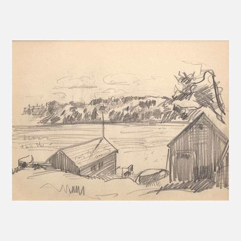 John Fulton Folinsbee (American, 1892-1972) 'Farm, Overturned Boat on Water', together with 'Cabin and Pines'