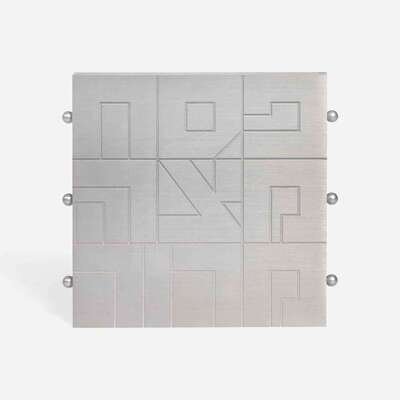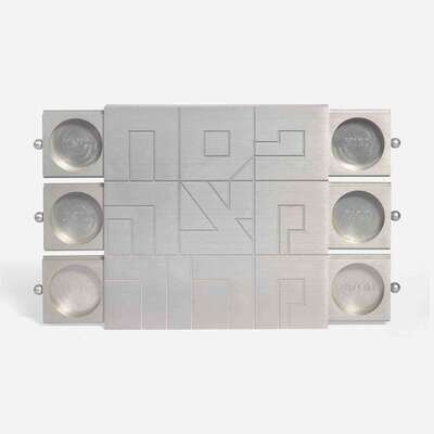 The sides with container slides for ceremonial foods, the interiors engraved with Hebrew script, "Pesach," "Matzah," and "Maror"