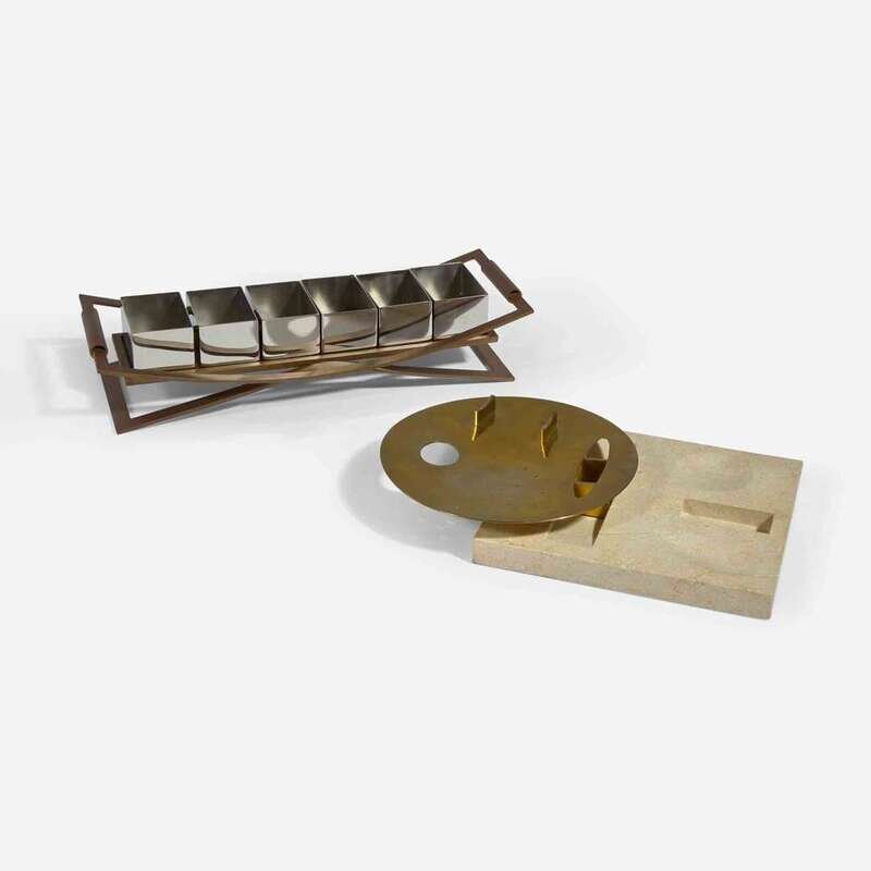 The Lizzie Katz tray consisting of bronze base with six stainless steel dishes, the underside of base initialed and numbered "3/50 LK."