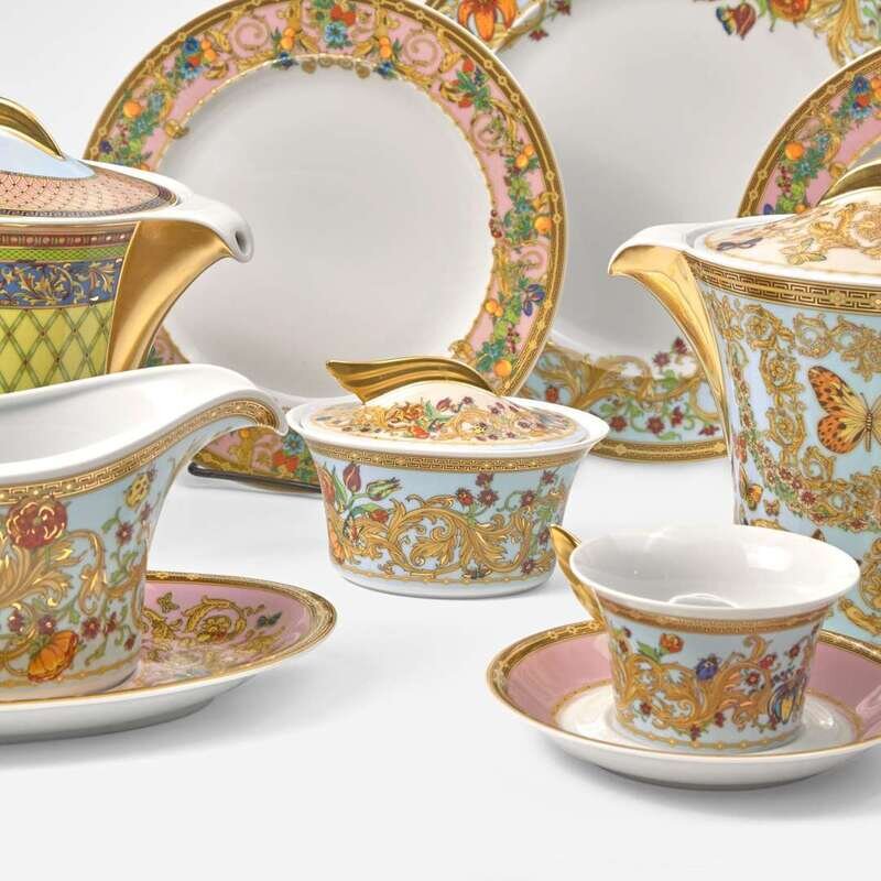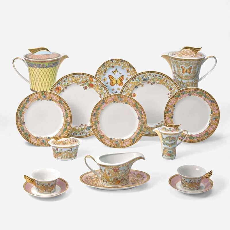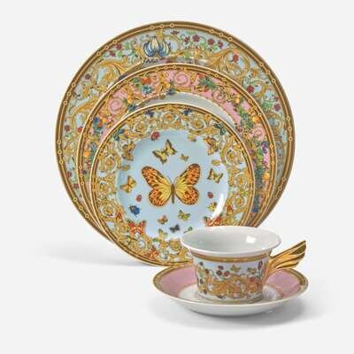 Printed with butterflies and scrolling foliage on blue and pink grounds, comprising fifteen dinner plates, fifteen salad plates, fifteen bread and butter plates, fifteen teacups and saucers, a gravy boat and separate underplate, a covered sugar bowl, a covered cream pitcher, and a covered teapot; together with a Versace for Rosenthal covered teapot in the "Russian Dream" pattern. (66).