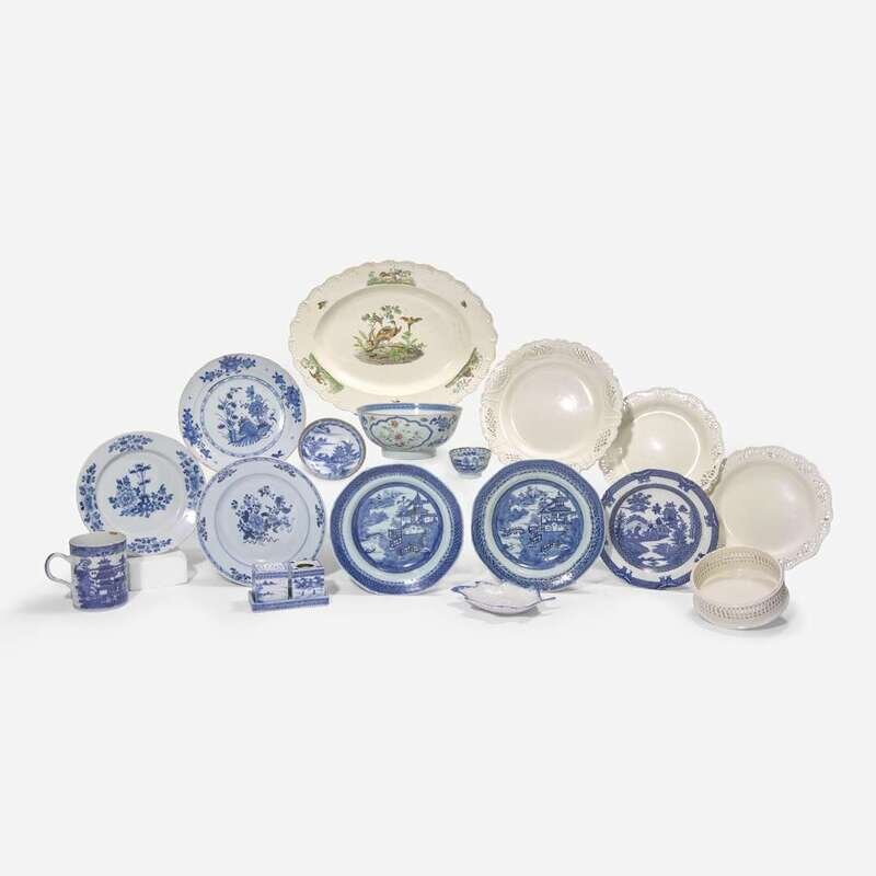 Comprising a transfer-decorated scalloped oval creamware platter with bird and insect motifs, possibly Leeds; a round scalloped and reticulated creamware dish, probably Leeds; a pair of round scalloped and reticulated creamware plates, marked "Wedgwood"; a pierced creamware bottle slider, probably Leeds; a blue feather-edge pearlware leaf-form pickle dish, marked with impressed anchor to underside, possibly Leeds; a Staffordshire blue and white chinoiserie transfer-decorated pearlware dish in the "Boy on Buffalo" pattern, possibly Spode; two Delft blue and white plates with floral motifs; a pair of Chinese Export porcelain octagonal dishes with blue and white landscape scenes; a Chinese Export porcelain plate with ribboned chrysanthemum motif; a Chinese Export porcelain blue and white mug; a Chinese Export porcelain blue and white three-part ink stand; a Chinese Export porcelain polychrome-decorated bowl; and a Chinese Export porcelain blue and white and gilt-decorated teabowl and saucer.