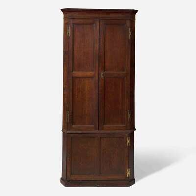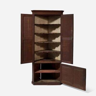 In two parts, the top section with carved molding above two paneled doors, the bottom section with one door, the interior with shaped shelves, molded base.