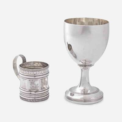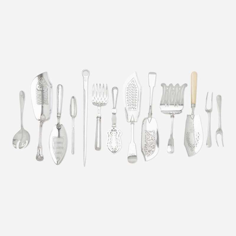 Comprising five sterling silver pierced fish servers / slices: one with rose and thistle motif, William Knight II, London, 1822, one in the "King" pattern with eagle crest to handle end, William Cummins (or Cumying), Dublin, 1820, one with monogram, "M," possibly by Michael Plummer, London, 1795, one with monogram, "WAB," by Thomas Wallis II & Jonathan Hayne, London, 1817, and one with monogram, "CEC," by George Adams, London, 1845; a pierced Sheffield silverplate serving fork, by Harrison Brothers & Howson, Sheffield, 1865; a George III sterling silver marrow scoop, maker's mark rubbed, London, 1766; a pair of George III sterling silver two-fronged forks with ram crest to underside of handle ends, Thomas Wallis II & Jonathan Hayne, London, 1820; a large George III sterling silver meat skewer with swan crest and monogram, "H," by William Fearn, London, 1810; a sterling silver asparagus server and pronged serving spoon, both with armorial crests to handle ends, the pronged spoon engraved, "I duP.C," to underside of handle end, both marked by Gorham Mfg. Co., Providence, Rhode Island, and retailed by J.E. Caldwell & Co., Philadelphia, Pennsylvania, 20th century; and a silverplated serving tongs, by Thomas Prime, Birmingham, late 19th century; together with a George III sterling silver goblet, probably Hester Bateman (mark partially rubbed), London, 1806; and a small American coin silver cup with repoussé and engraved decoration, engraved "Charles M. Simonson" to front, marked "Z. Bostwick" to underside, by Zalmon Bostwick (active 1846-1852), New York, circa 1850; all items marked (15 items total).